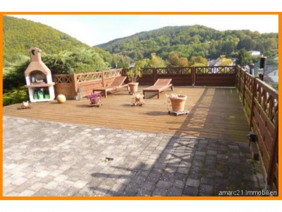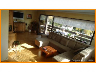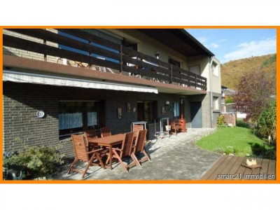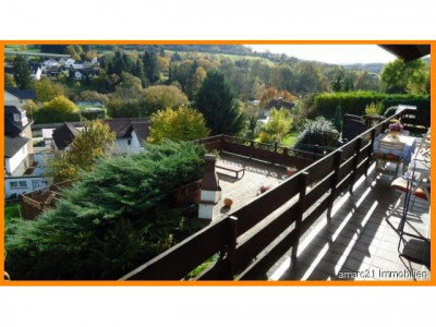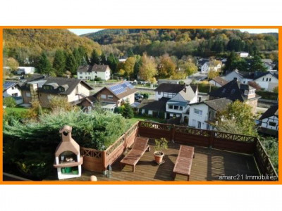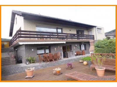 Eine herrliche Rarität ist dieses1977 erbaute Eifelblick-Einfamilienhaus mit zwei Vollgeschossen und einem Keller, in dem Sie auch die Einliegerwohnung - mit separatem Eingang - finden. Das freistehende Einfamilienhaus wurde in Massivbauweise 1977 auf einem etwa 820 m² großen Grundstück in herrlicher Hanglage errichtet und liebevoll familiengerecht ausgestattet. Neben der modernen Haustür bieten große Fensterfronten rundherum einen ebenso formschönen, wie praktischen Kontrast und ergänzen die Räume im barrierefreien Erdgeschoss und dem Gartengeschoss auf eine elegante und filigrane Weise. Aufteilung: Die großzügige Beletage mit hochwertigen Fliesen- und Parkettböden ist wie folgt aufgeteilt: Im vorderen Bereich dieser Rarität befindet sich auf der linken Seite der Schlaftrakt mit 2 großen Schlafzimmern und einem Vollbad. Ebenfalls linksseitig finden Sie den Treppenabgang in das Gartengeschoss mit Zugang zur Einliegerwohnung.Rechtsseitig vom Eingang gelangen Sie in die schöne große Küche, die - beinahe fließend - in den mit Licht erfüllten Wohn-/Essbereich übergeht. Vom Küchenbereich aus wurde ein praktischer Abstellraum - das Herzchen - platziert. Ein praktisches Gäste-WC am Wohntrakt sorgt hier für kurze Wege. Highlight ist unter anderem der traumhafte Eifelblick, den Sie vom umlaufenden Balkon beinahe aus jeder Sicht bewundern können.Vis à vis des Eingangs, über die lichterfüllte Diele, finden Sie einen weiteren Zugang in das überaus weiträumige Wohn-/Esszimmer.Im Gartengeschoss erschließen sich insgesamt zwei Schlafzimmer, ein Duschbad mit WC, ein Wohn-/Esszimmer mit Terrasse und ebenfalls gigantischem Ausblick in die Eifel.Neben der Einliegerwohnung wurde hier weiterhin ein Wellnessbereich mit Sauna und Dusche sowie ein weiteres WC platziert. Im Heizölraum findet der Bastler in einer Werkstatt platz für handwerkliche Aktivitäten. Dieses Haus - für alle Lebensumstände wohldimensioniert- wird Sie begeistern. Eine große Garage mit angrenzender Werkstatt und Stellplätze vor dem Haus bieten Ihnen hier eine komfortabel nutzbare Fläche für Ihre Fahrzeuge.Rundherum genießen Sie den Blick in den unverbaubaren Garten mit Terrassen auf verschiedenen Gartenebenen formschön unterteilt.